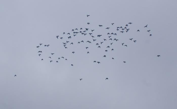 遅く飛び始めた「12羽」の鳩くんは一生懸命前から飛んでいる集団を追いかけていましたが、集団に追いつけない鳩くんが「2羽」離れたり追いついたりしていると、其処に追っていた「12羽」の鳩くんもやっと追いついて待望の一塊になりました。