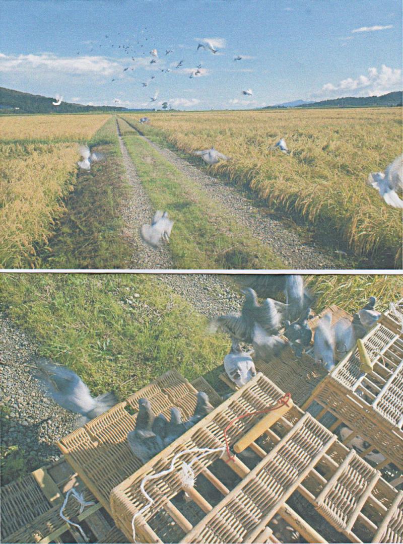 詰め込み終わると羽数が「100羽」居たので前回の訓練では失踪も無く、7時08分に気持ち良く家を出発しました。目的地まではスムーズに走って7時40分に到着して田んぼの畦道に「バスケット」を並べました。