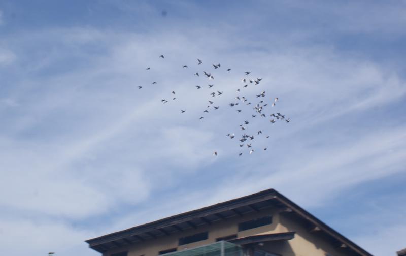 「釣竿」を回収すると鳩くんは直ぐに下りて来ましたが、入舎口が閉まっているので外で遊ぶしかありません。管理人が他の鳩くんの世話をしていると突然何かに驚いて飛び立ったので、見に行くと集団で飛んでいて1羽も屋根には止まって居なくて集団で飛んでいたので「これも勉強だ?」と言ってあげました。