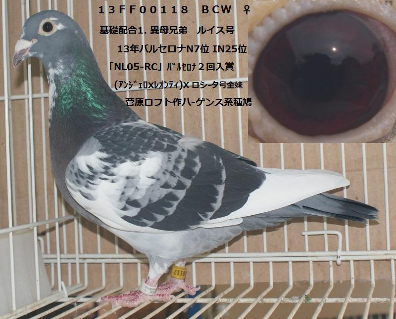 鳩番号「13FF00118 BCW♀」菅原ロフト作 異母兄弟鳩 ハーゲンス鳩舎作翔 ルイス号 13年バルセロナN6912羽中7位 IN25382羽中25位鳩がいます。バルセロナN1160K2回入賞(アンジェロ号 ×レオンティ号) × ロシータ号全妹鳩