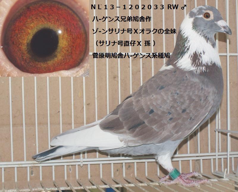 出品鳩順一番と三番目の父親「NL13−120033 RW ♂」ハーゲンス兄弟鳩舎作出 ゾーンサリナ号 × オラクの全妹鳩 との直仔で、皆様ご存知の サリナ号直仔×孫鳩 交配の近親孫鳩となります。