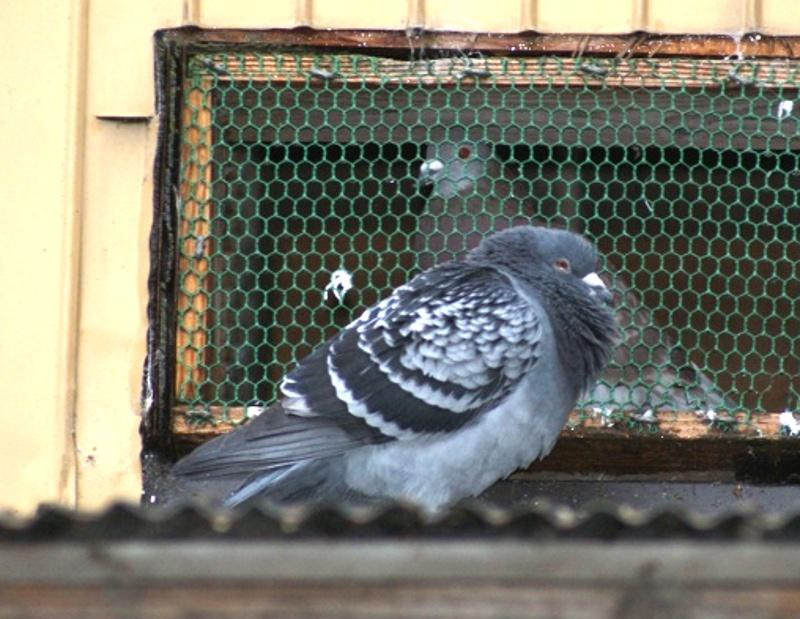外は肌寒いので疲労回復が進まないと思って「黒糖」をお湯に融かして与えようと「ボール」に準備して9時過ぎに鳩舎に向おうと外に出ると、目の前の階段の屋根に「BC♂くん」が通気口の金網から入ろうとしているのを発見しました。