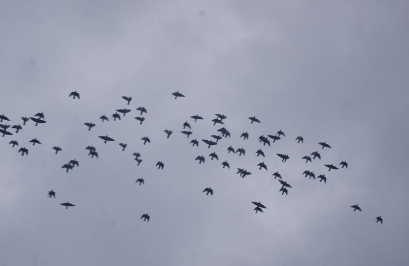 30分位で給餌を終わらせてから、選手鳩くんの「舎外」の様子を見ると屋根に「4羽」止まっていましたが他の鳩くんは鳩舎を大回りしながら集団で飛んで居て下りる気配は有りません。