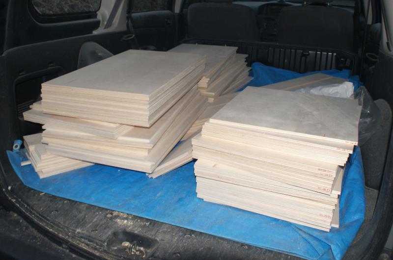 管理人は不器用なので、製作は連合会のプロにお願いしましたが、材料は管理人が調達するので、やっと「ホームセンター」に行って購入してきました。初めてでしたが「巣箱」のサイズにコンパネを指定寸法で21個分切断して貰いましたが、以外にコンパクトに収まって拍子抜けでした。---車の中で保管中の写真を撮りましたので掲載します。
