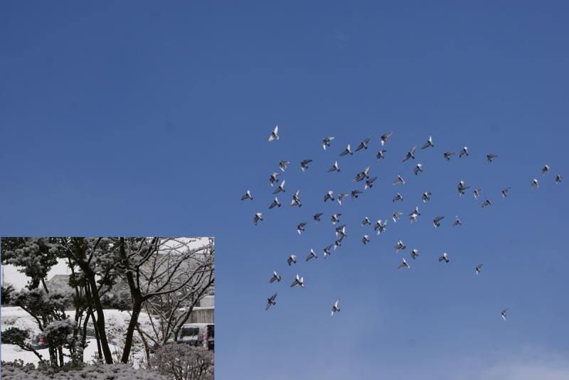 予想もしない「青空」の中、鳩くんたちは三日振りの「舎外」で最初は鳩舎の周りを回っていましたが、やっと遠くへ行きだして「R7号線」付近で飛びだしたので後は鳩くん任せにして管理人は他の鳩くんの管理を始めました。