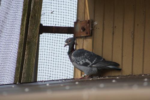 外で見ているのを諦めて、家に戻って鳩くんの帰りを待っていると「ピーピー」と聞えたので帰って来たと思って、窓越しに外を見ていると鳩くんが帰って来るのが見えたので外に行くと「1羽」一階の分離鳩舎の屋根の上に大怪我をしている「BCWくん」が見えました。