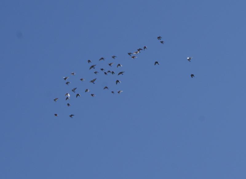まだ下りる気配は当然ないので「ブログ用」にと思って「舎外風景」を撮影して、カメラを仕舞いに行って戻って来ると環境は一変していました。眼の前を鳩くんがバラバラで通り過ぎると、その後を黒い弾丸「隼くん」が追いかけて「空中戦」です。--折角撮影したので「空中戦」の前の「舎外風景」を掲載します。