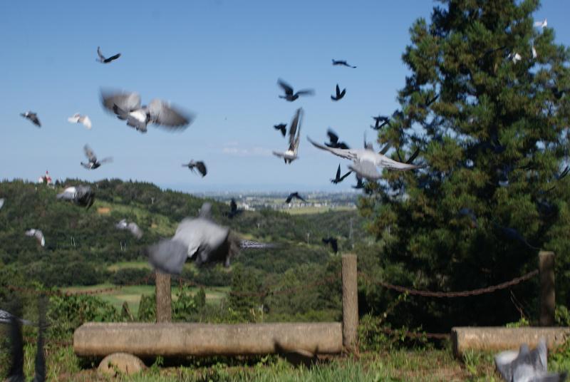 先に出た鳩くんたちは集団で一気に目の前の山を通り越して新潟方面で旋回していました。その後を遅く出た鳩くんが追いかけているようでしたが、集団の鳩くんたちは西へ方向変換して飛び始めたように見えて、遅く出た「2羽」の鳩くんは着いて行けません?。