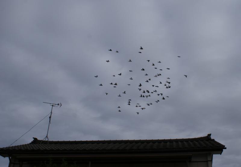 数にすると「70〜80羽」の塊で「岡ちゃん」の鳩くんとは違うコースで飛んで来たと思いました。少し早く来た鳩くんは「岡ちゃん」の鳩くんと一緒に帰還して、今姿を現した鳩くんたちは別コースで帰還したと考えましたが「岡ちゃん」の鳩くんの方が早く帰還したと思いました。---今秋も活躍しそうな「岡ちゃん」でした。
