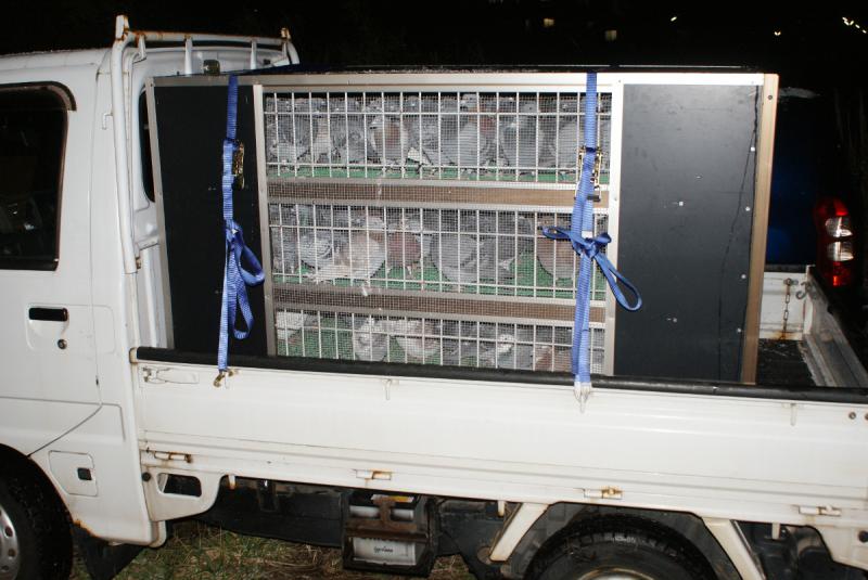 今回の「長岡訓練」は、6鳩舎230羽位の参加だったので、「哲ちゃん」が作った「ケージ」で間にあいました。---軽トラックに積んだ「ケージ」の写真を撮ったので投稿します。