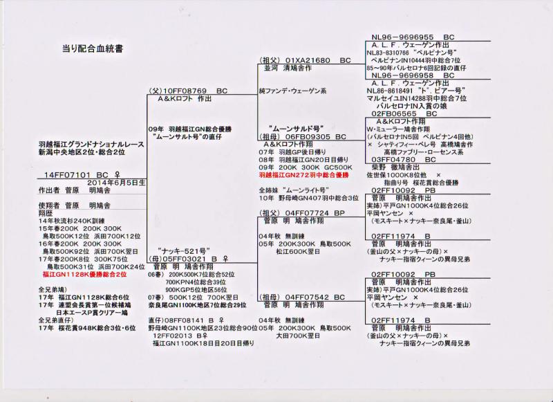 今日は、今年の春レースと管理人の「ブログ」で大活躍した「当り配合」を紹介させて頂きます。---血統書を添付させて頂きますので参照して下さい。