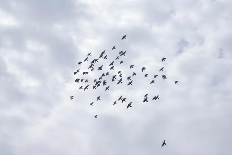 今日は久し振りに「ブログ」を書こうと考えていたので「舎外風景」を載せようと思って撮影をしました。「90羽位」の鳩くんが一塊で飛んでいる様子を撮影出来て満足して他の鳩くんの管理をしていると又もや低空飛行での旋回の凄い羽ばたきの音で見上げると「オオタカくん」に襲われて羽根が飛散していました。