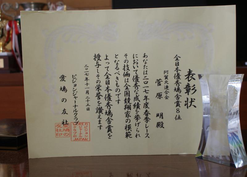 でも、管理人は30年振りの二回目の「地区チャンピォン賞」受賞で、入賞率も「八番目」で、考えられない成績に成ってしまい「全日本最優秀鳩舎賞八位」と言う表彰状を頂きました。写真を添付しますが、クリスタル製記念品は何層にもなっていて斜めから光を当てると屈折により素晴らしい光景に成るのですが写真で上手に表現できなくて残念です。