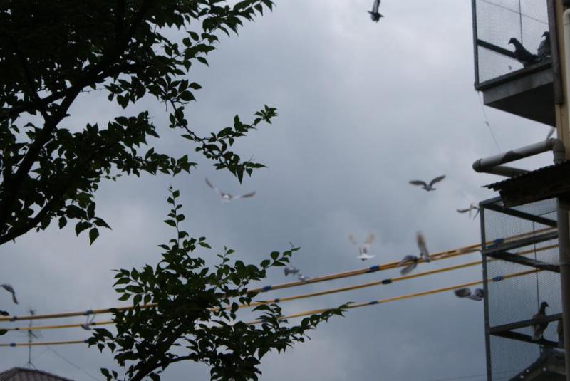 手前の鳩舎の鳩くんが飛び立ち始めるとやっと視界に入ってきたので「シャッタ-」を切り始めました。全部の鳩くんが出たのを確認してもらってから「春ちゃん」に「釣竿」で屋根に止まっている鳩くんを追って貰うと「10羽」位飛び立ちました。
