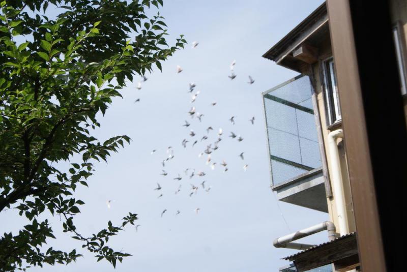 9時頃に「岡ちゃん」が選手鳩舎に向かったので、今日も管理人は窓際の椅子に座って待っています。「選手鳩くん」が出始めました。今日は一昨日よりスムーズに出ています、どんどん上空に鳩くんの集団が大きくなっているようにみえます。