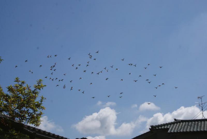 飛ばした「選手鳩くん」は、10時10分頃に成ると大半の鳩くんは屋根で遊んでいたので、予定通り管理人はふたたび「釣竿」を「オッー」と大きな掛け声と一緒に振り回すと鳩くん達は声にも驚いたのが一斉に飛び立ちました。