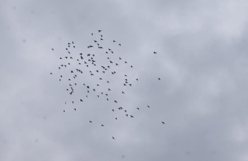 管理人はその横で「今年の若鳩くんを早く飛べるようにしたい?」の一心で、飛んでいる鳩くんの様子を見ながら「釣竿」をタイミングを見て振っていました。飛んでいる鳩くんの様子を見ながら管理人は直感で羽数を想像しました。大きな塊で飛んでいるのが「130羽」位、その周りが「10羽」位で合計「140羽」位か?と思っていると、「この集団の鳩くんをカメラに収めれば数えられる?」と思い「カメラ」におさめました。---その写真を「ブログ」に掲載します。