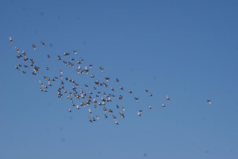 もう一羽の「BCW♀成鳩くん」はもう一度飛んで貰おうと掴んで下りて行って、歩いて直ぐ傍の「たんぼ」まで持って行こうと歩きだすと塊から分かれた鳩くん達「15羽」位が低空飛行で今でも下りそうなので「BCW♀鳩くん」を空に向かって放してから急いで戻って「釣竿」を振り回して何とか飛び気に成って貰いました。