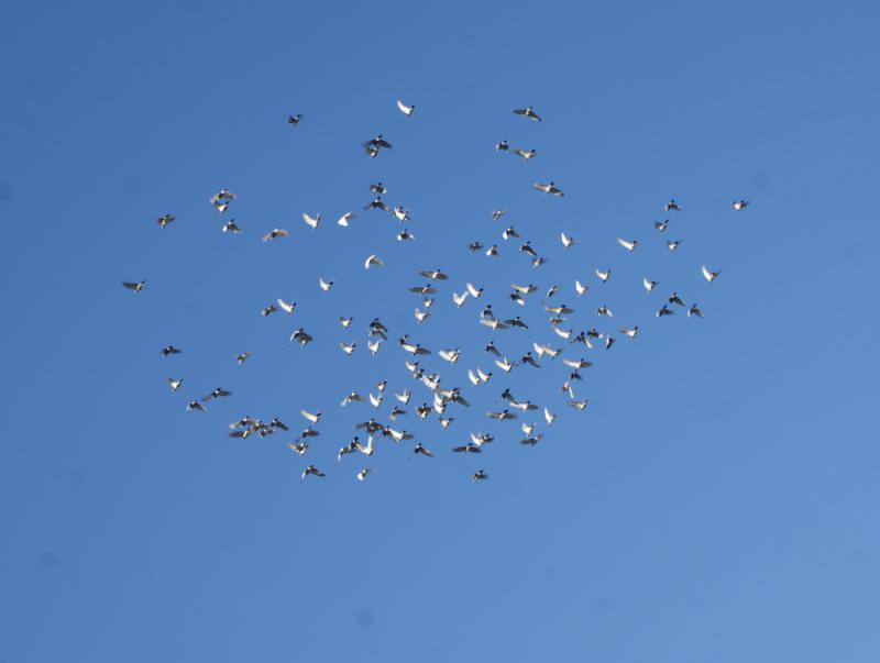 低空飛行の鳩くんの羽ばたきがフル回転に成ったので、何か在った?と思って見回すと左の空から「オオタカくん」の登場です。鳩くん達は高度上げて行くと集団の鳩くん達も別れて4個の集団でバラバラに飛んでいました。