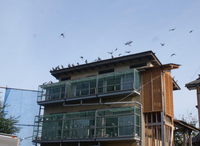 それから上空の鳩くんを探しましたが、もう姿は見当たりません。行ってしまったのかナー?と思いながら「バスケット」を車に積み込んで帰路に着きましたが、途中でも鳩くんの気配は感じないまま「鳩舎」の見える場所まで来ると「鳩舎」の屋根一面に鳩くんが止まって「20羽ぐらい」飛んでいました。
