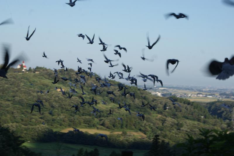 到着直前に鳩舎は見えるので、鳩くんの姿が確認できるか興味深々でしたが気配も感じられずに、この暑い中「一時間」経っているので少し心配でしたが駐車場に到着して「展望台」を見あげると何羽かが見えたので「帰って来ている?」と思いましたが、周辺にはやはり鳩くんの気配が有りません。