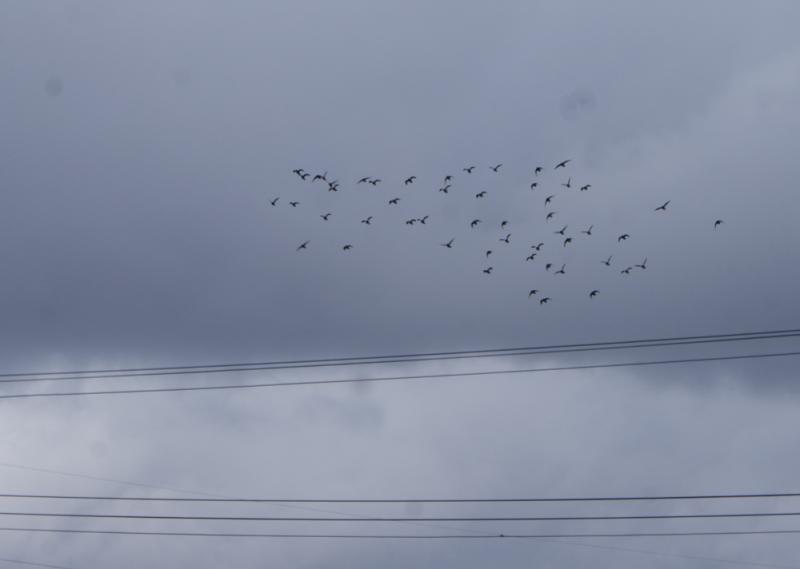 30分位経った頃に、やっと戻ってこようとこちらに向かって来たので、ここぞ?と思いシャッターを切りました。そして、一羽飛ばないで屋根に止まっていた鳩くん目掛けて「釣り竿」の洗礼を浴びせると驚いで飛び立つて集団の鳩くんと一緒に飛び始めてくれました。