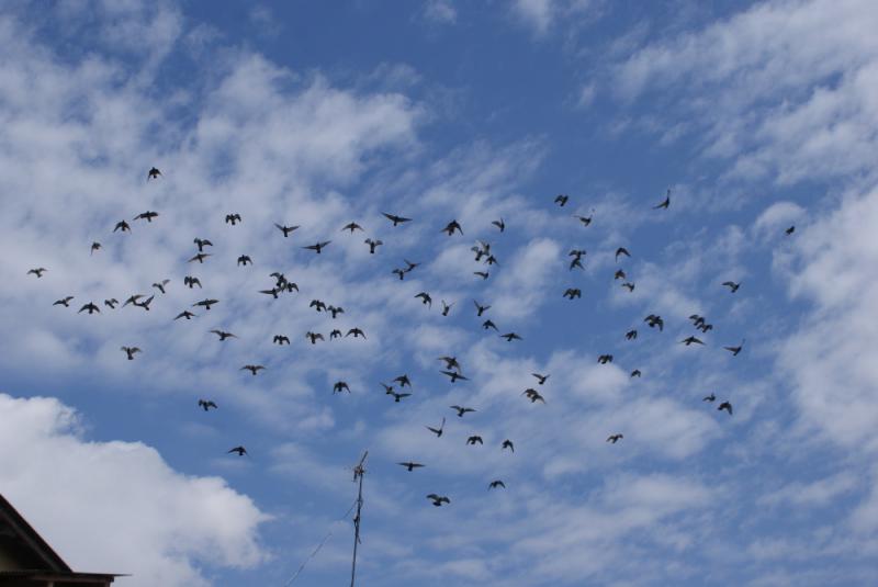 午後になっても静かで、外に出ている鳩くん達は「怖さ知らず」のためか「40羽位」の集団で飛んでいました。そのために「入舎」する鳩くんが少なくて夕方になっても「20羽位」しか入っていませんが暗く成れば怖がって入ってくれると気楽にしていました。