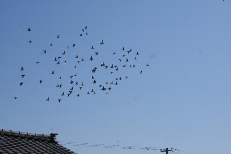 ウロウロ飛んでいる鳩くん達は集団に入ることもなく「10分位」で降りてきましたが、その他の鳩くんたとは「30分」近く飛んでくれました。今日も「カラスくん」「猛禽くん」の姿がなくて余裕の鳩くん達は鳩舎に入らなくて「休んでは飛んで?」「休んでは飛んで?」を繰り返して遊んでいます。