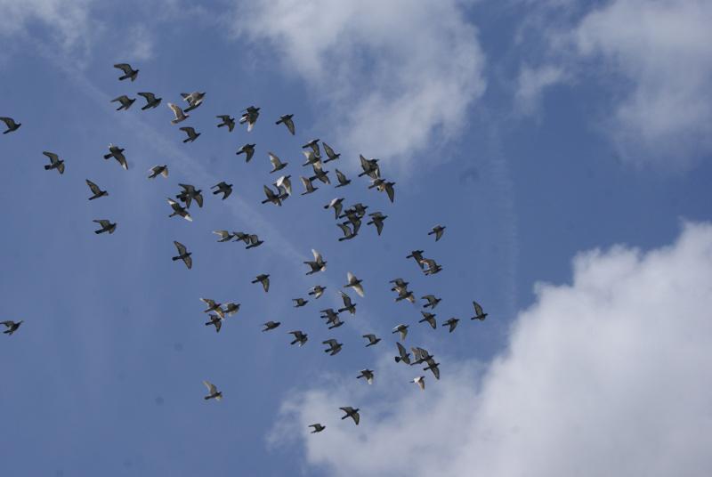「一時間」のノルマ時間が過ぎても他の鳩くんは姿を見せません。「65分」経過した頃に「8羽」の鳩くんが戻ってきて暫く旋回をしていましたが下りてきました。管理人は少し不安になって隣の空き地に登って空を見上げているとやっと「豆粒の集団」を発見しましたが数は「70羽位」なので足りないので、周りを一生懸命見ていると「居ました」すこし離れて「20羽位」の集団が?合計の鳩くんの数が合いそうなので一安心していました。