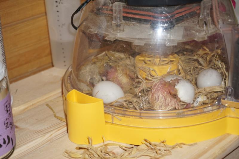 「15時過ぎ」に元気にやっと生まれてきました。これで一気に「人工孵化3号4号」の誕生です。 今回も「お尻」から出てきました。---その瞬間の写真を掲載します。「人工孵化2号3号」も一緒に写っています。