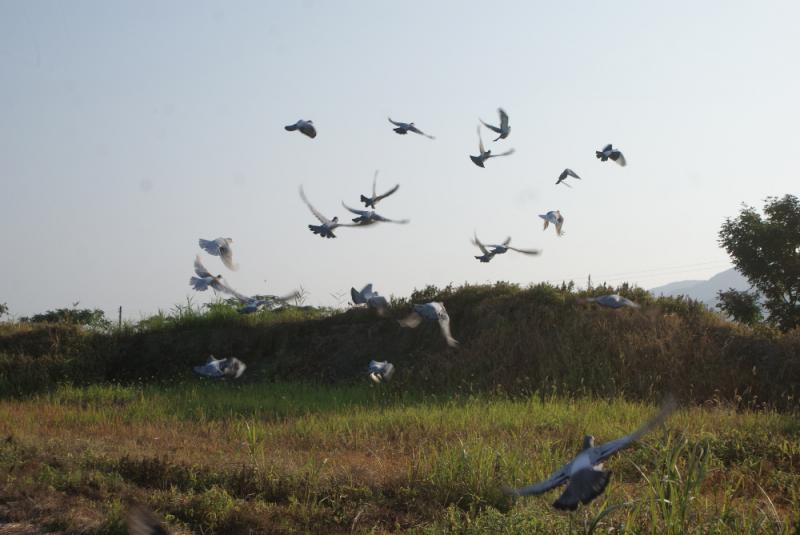 でも、出てからの飛び具合は今一で、最初は逆方向で旋回していたが段々帰還地方向で旋回をしていました。その中から「12羽」が群れを離れて羽ばたきもゆっくりになったので心配でしたが、又、一緒の群れになって旋回している時に管理人は鳩くんを追い越して鳩舎に向かいました。