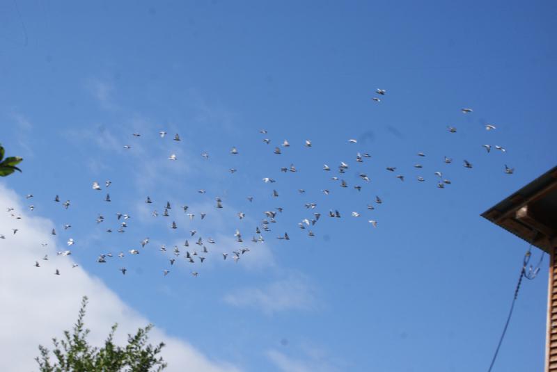 管理人は最初の訓練でその年の雛鳩くんの健康状態がチェック出来ると考えております。「バラバラでの帰還」は問題外で、帰還時間に関係なく「纏まっての帰還」をしていれば「雛鳩くん」の状態は良いと判断しています。根拠は沢山の鳩くん「一塊で飛ぶ」と言う事は一羽一羽の鳩くんが自分の意志を抑えて他の鳩くん達に合わせられることによって成り立つ平常心を維持出来るからです。---平常心は健全な身体から生まれるからてす。