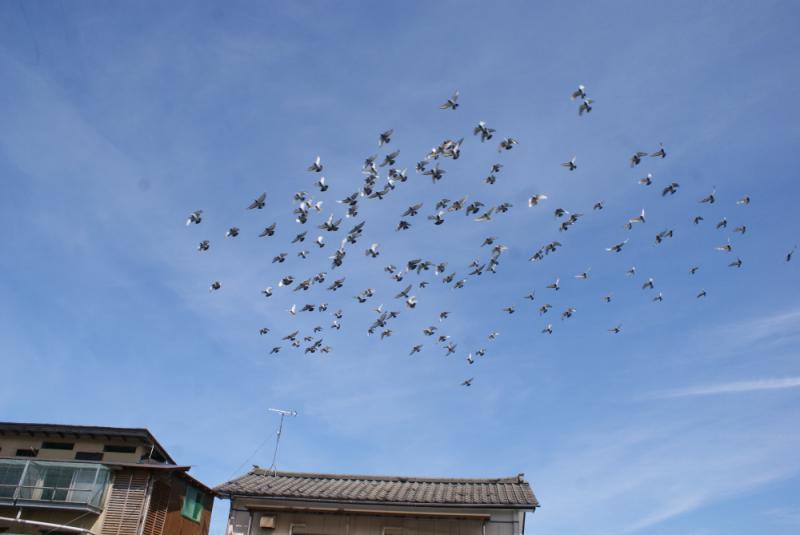 外に行くと「鳩くん」が雄大に飛んでいる鳩くんが確認できたので「カメラ」を持って隣の空き地に向かいました。全鳩くん一塊で帰還したのだ?と思って「チャッター」を切っていましたが、管理人には余り感じないのですが鳩くん達は異常に「低空飛行」で隣の母屋の二階の屋根に「バシー」と擦れる音がしました。