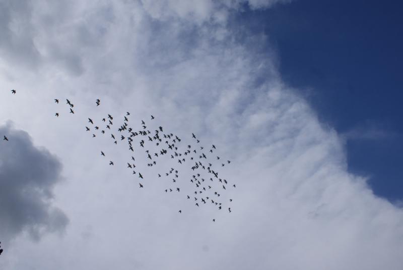 二日振りの影響か?少し待っていると「10分位」で一つの集団で飛び始めたのでなるべく全鳩くんが収まるように撮影をしました。---後で写真を引き伸ばして「羽数チェック」に使おうか?と考えたのです。一番臨場感のある写真を掲載します。