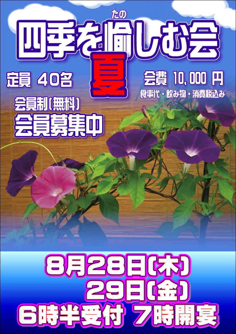 四季折々の食材で愉しむ『四季を愉しむ会 夏』を8月28日、29日7時より開催いたします。テーブルが4人席のため、カップルや女性どうしの偶数メンバーでのご参加をお待ちしております。『四季を愉しむ会』の会員様も随時募集しておりますので、お気軽にお問い合わせください。