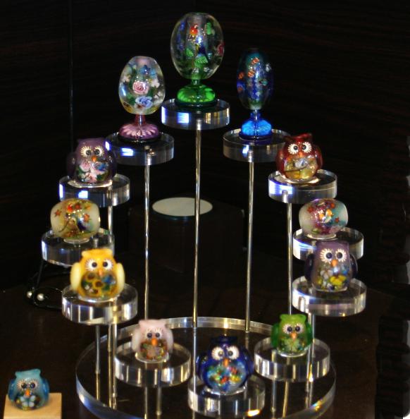 ガラスを溶かし2から3cmの玉にして、その中に花や動物などいろいろなモチーフの模様をちりばめています。