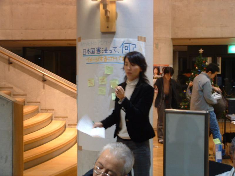 「日本国憲法」と聞いてイメージした言葉を教えてください―という質問の回答を付箋に書いてもらい、紙に貼りつけました。それをもとに雑談会をしました。