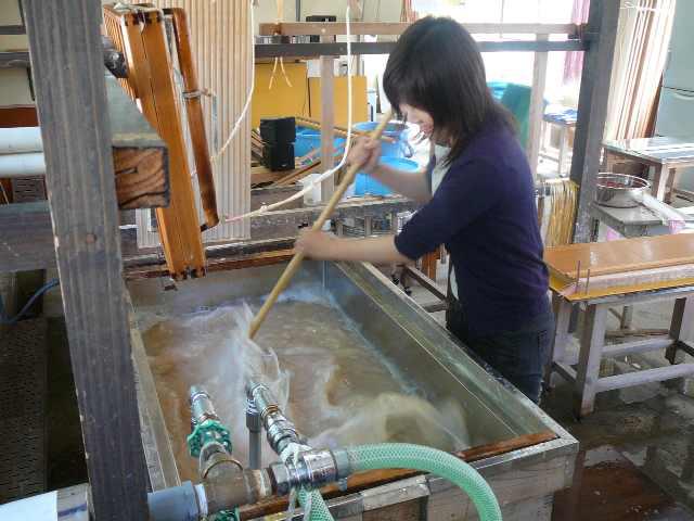 紙すきをしているうちに、原料が足りなくなってきました。原料を足して繊維が細かく均一になるまで「まぜまぜ」しています。