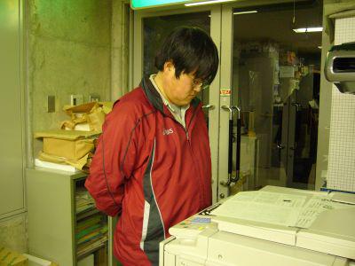 がんばって印刷している「印刷機」を暖かく見守る担当・小林くん。