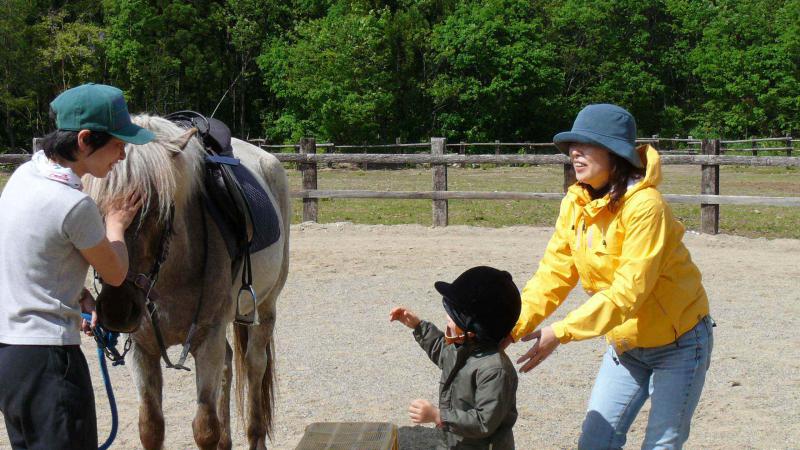 林太郎にのって楽しそうにしている男の子とお母さん。