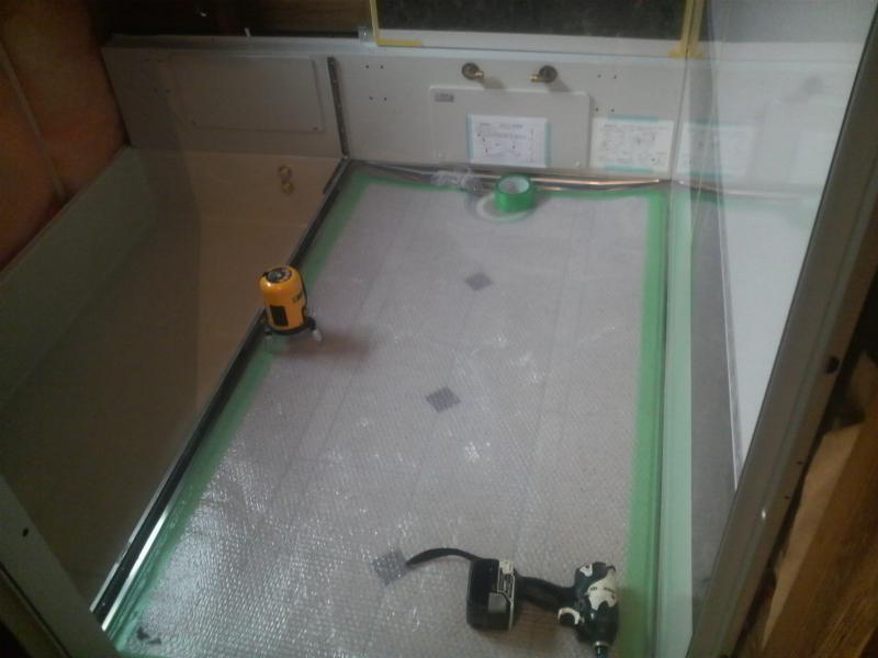 架台の上に防水パンという洗い場と浴槽がのる部分を取り付ける。