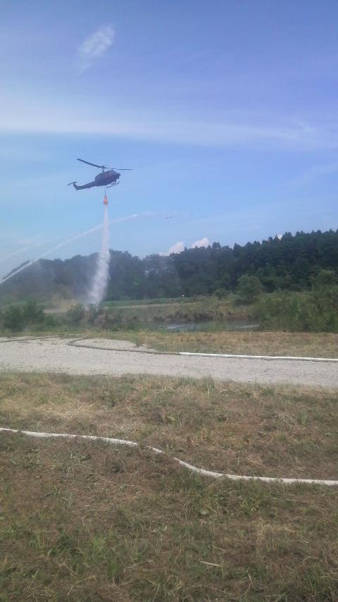 ヘリコプターが上空から水まき。