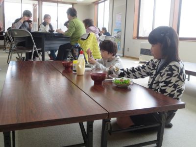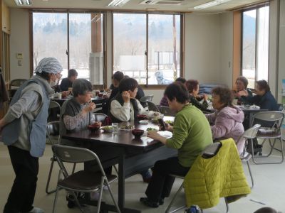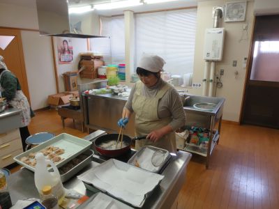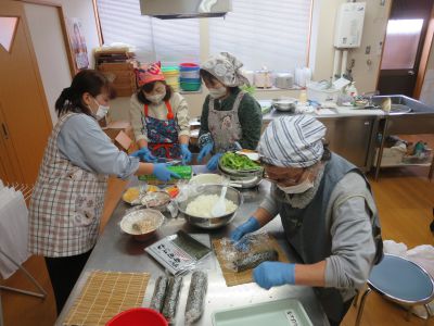 今回は手ノ子地区の有志の方4名の方で宝巻(太巻き)と豆苗スープ、鶏から揚げを作っていただきました。