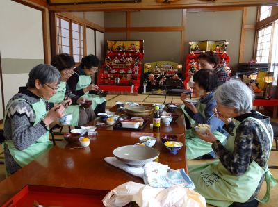 調理実習のメニューは「豚バラ肉と白菜のミルフィーユ鍋」「野菜とベーコンのコンソメスープ」「大豆缶とツナのマリネサラダ」を作り、試食会は研修室でお雛様に囲まれて楽しく行われました。