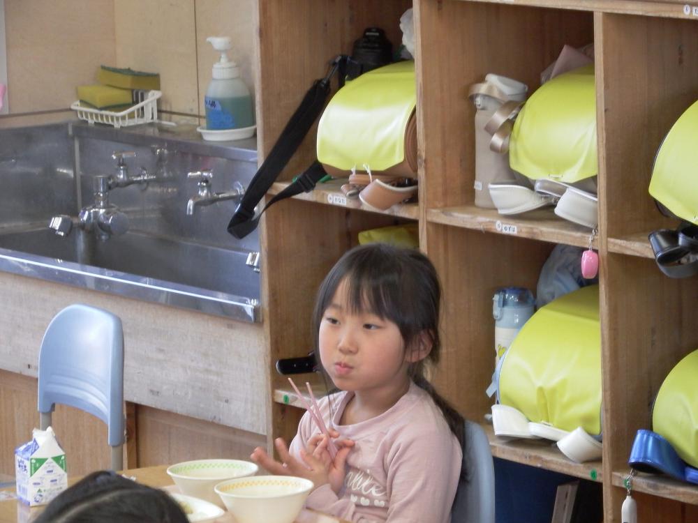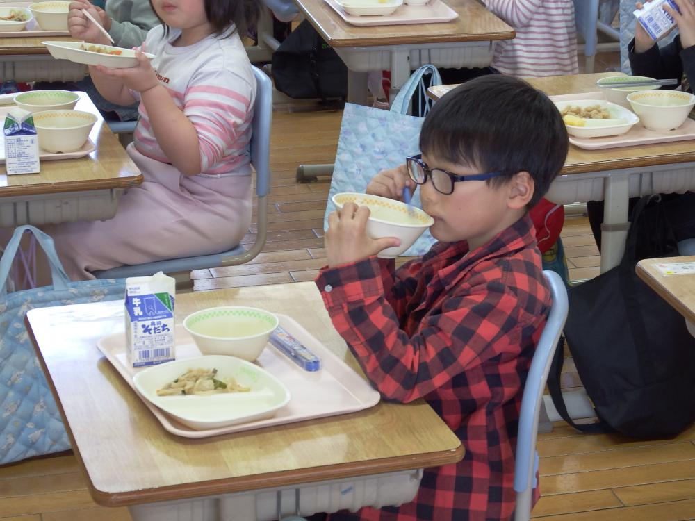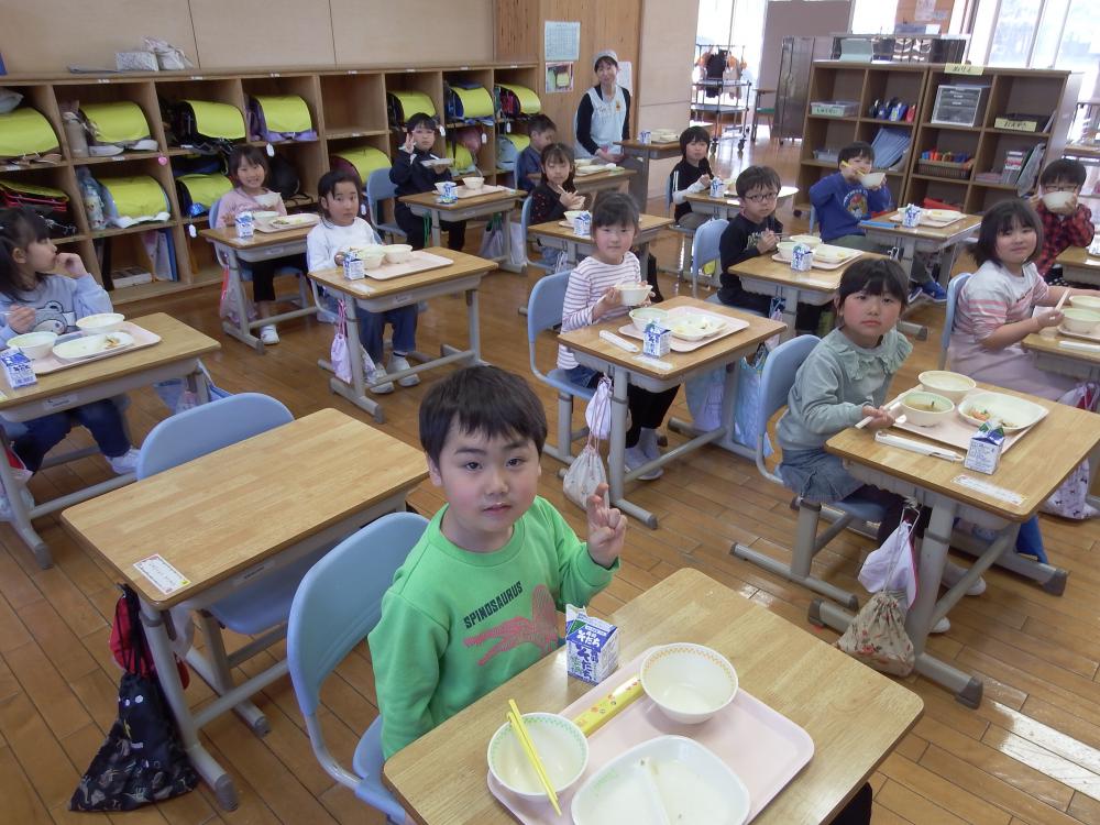 この日のメニューは、ごはん・牛乳・みそワンタンスープ・厚焼き卵・切り干し大根と豚肉の煮物でした。みんな笑顔でおいしくいただきました。また、おかわりする子もいました。これからの給食も楽しみですね!