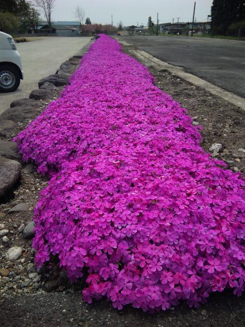 長井駅の南側の芝桜が綺麗に咲いています。山形鉄道の成沢元専務が丹精込めて世話してこられたもので、レッドカーペットならぬピンクカーペットになっています。