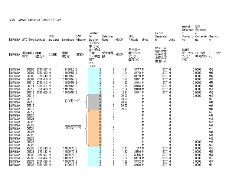 GPRMC項で説明するが、DRモードで出力されるのは、速度と進行方向情報のみらしい。