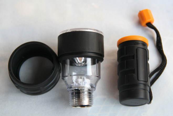 左からヘッド保護用のゴム,ランプ本体,電池ホルダを兼ねたグリップ。