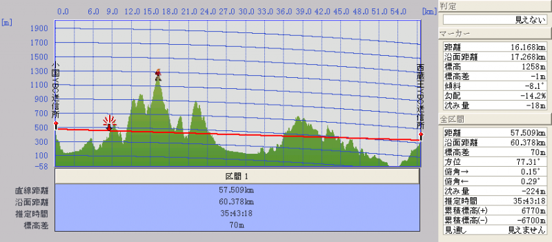 経路途中にある最も高い、小国局から16km程の所(図のマーカー(人のアイコン)の位置)にある1250m程の山は長井市西方にある「三体山」のようで、この山のほぼ頂上を狙って小国局の位置が決定された感じがします。