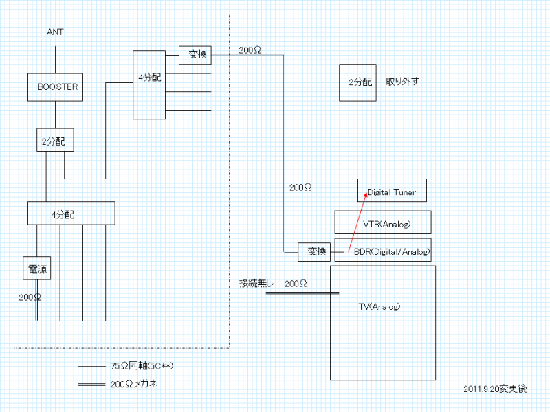 まずは、analogのTVには接続不要なので、2分配器(200Ω)から変換を経由してTUNERへ・・・